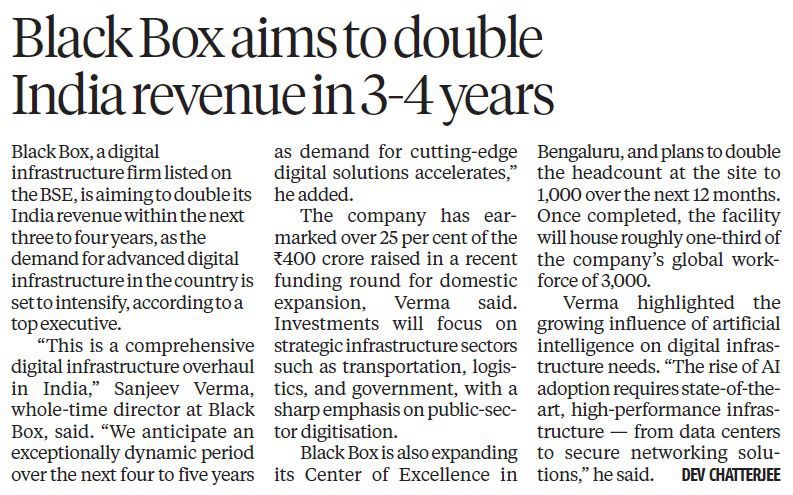 Black Box Ltd, a digital infrastructure firm listed on the Bombay Stock Exchange, is aiming to double its India revenue within the next three to four years, as the country ramps up modernisation and demand for advanced digital infrastructure intensifies,
