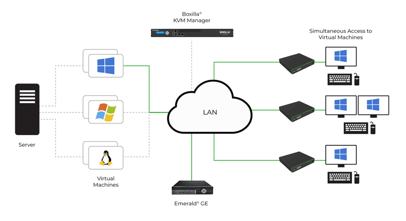 The award-winning Black Box Emerald KVM-over-IP platform is an infinitely scalable universal access system, enabling users to connect to physical and virtual machines, with anywhere, anytime IP access over an existing IP network, WAN, or the Internet. Advanced security and a market-leading tiny bandwidth consumption streamline user access to local and distributed remote systems.