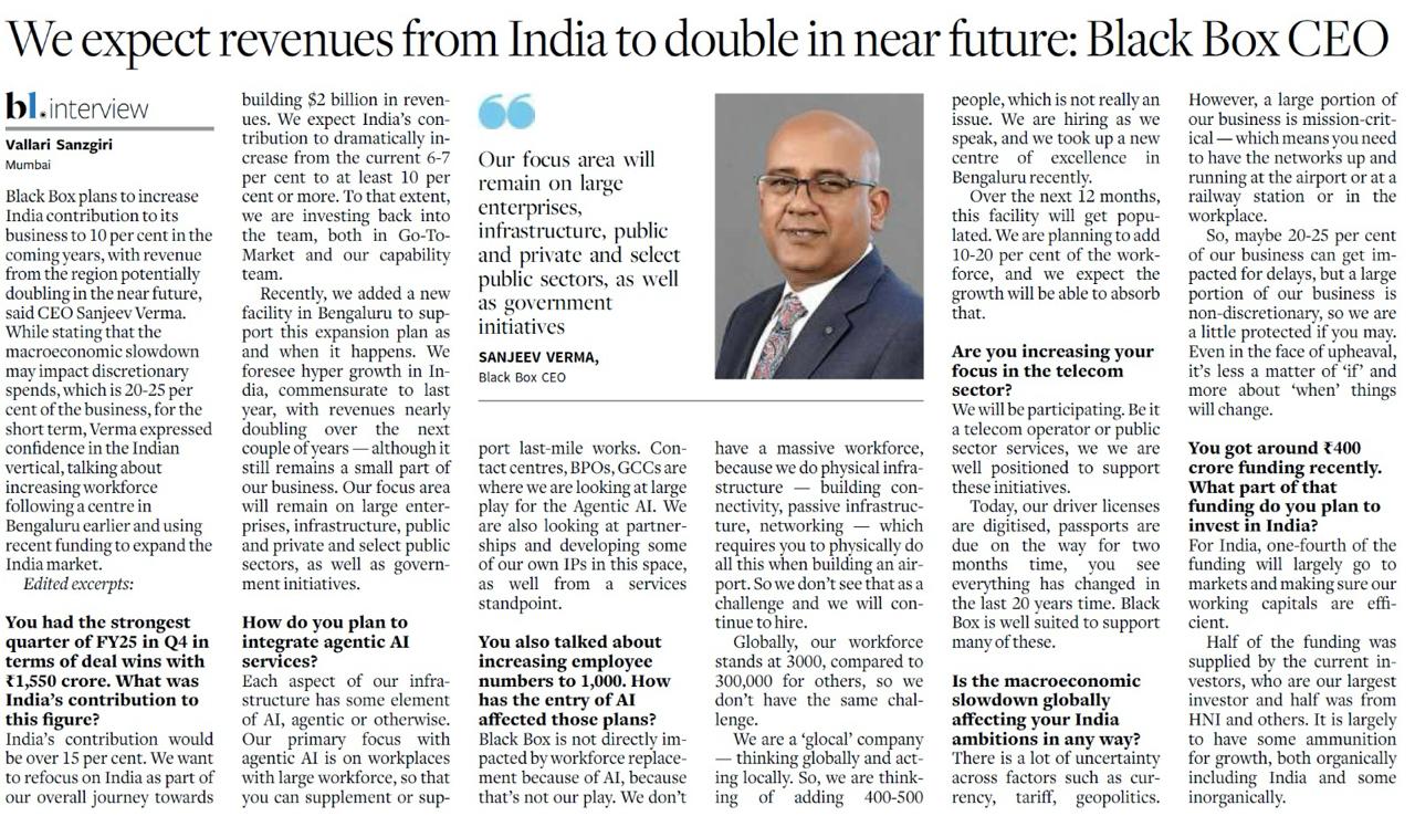 Black Box plans to increase India contribution to 10 per cent of its business in coming years, with revenue from the region potentially doubling in the near-future, Sanjeev Verma, Black Box CEO, told businessline. While stating that the macroeconomic slowdown may impact discretionary spends, which is 20-25 per cent of the business, for the short-term, Verma expressed confidence in the Indian vertical, talking about increasing workforce following a centre in Bengaluru earlier and using recent funding to expand the India market.